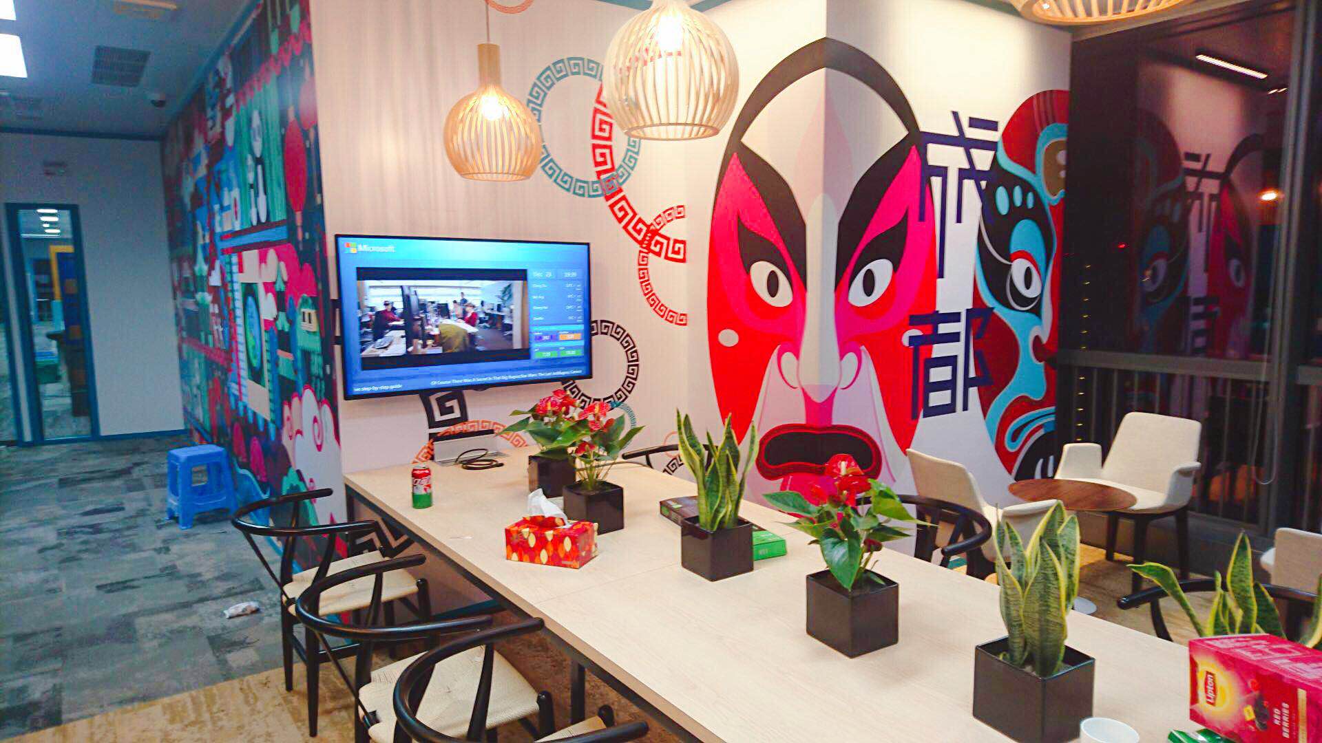 金橋不僅為微軟傾心打造了智能化的高科技會議室,而且充分結合當地的風土人情和元素,打造了輕松休閑的hub space,會議之余,繼續頭腦風暴。例如微軟成都的臉譜、熊貓、竹子和太極八卦,徹頭徹尾的“成都范兒風格”;微軟福州的中國風墻面,現代化與城市特色完美結合,極大地增加了愉悅高效的會議體驗。