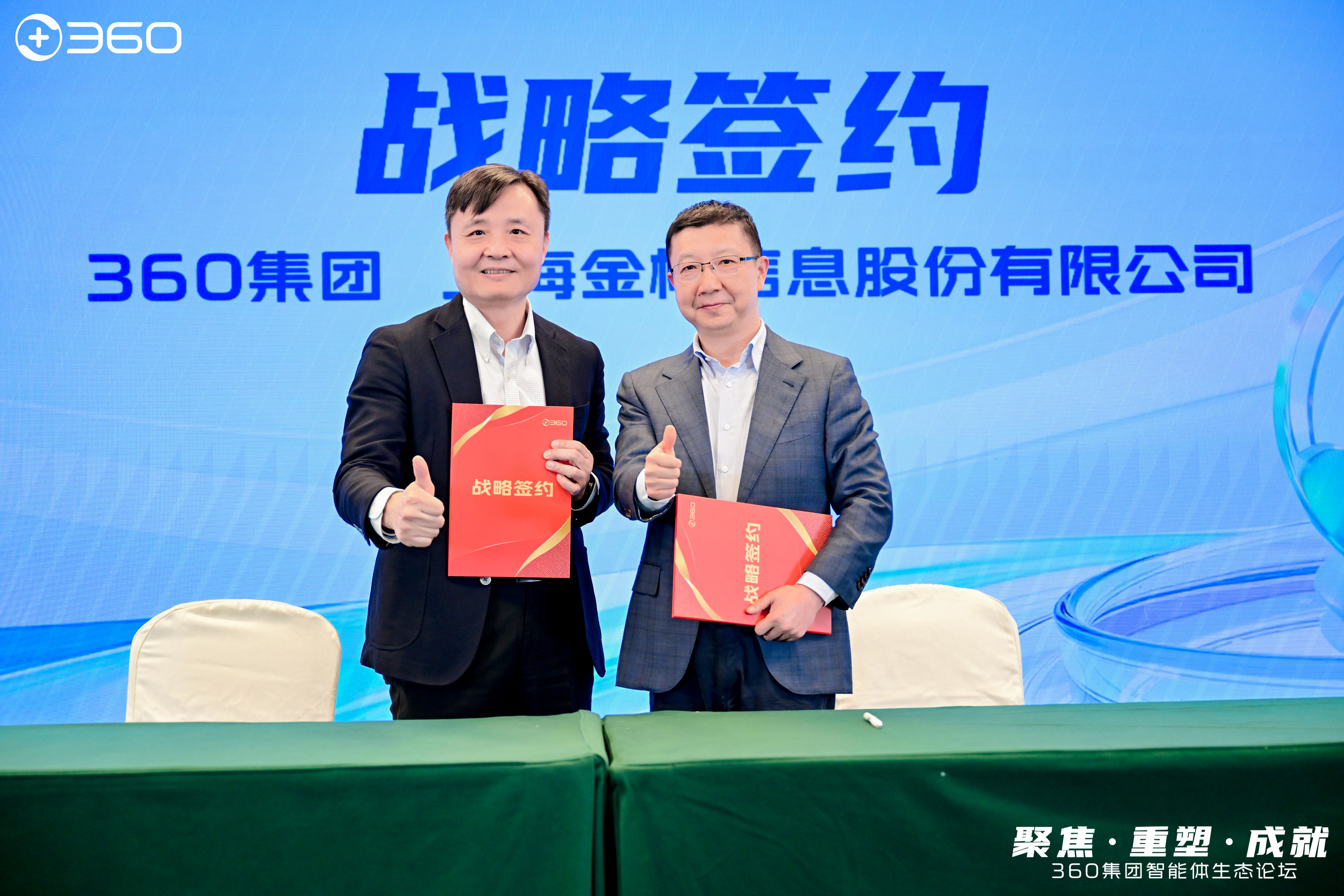 在全體嘉賓見證下,金橋信息與360集團正式簽署戰略合作協議。這一重要合作標志著雙方將圍繞智能體平臺開發、行業解決方案融合、數據安全協同等方向展開全方位合作,共同推動智能體技術在政務、司法、教育等重點行業的創新應用。
